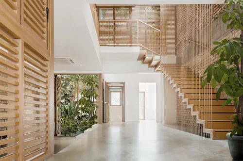 The key feature of the house are the two full height internal courtyards with a louvered curtain walling system that encourages natural ventilation and natural light into the deep plan of the terraced house. The louvered curtain walling systems allows for the flexibility of privacy depending on how the rooms are being used.
