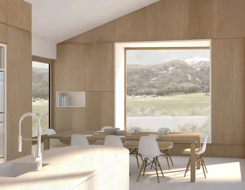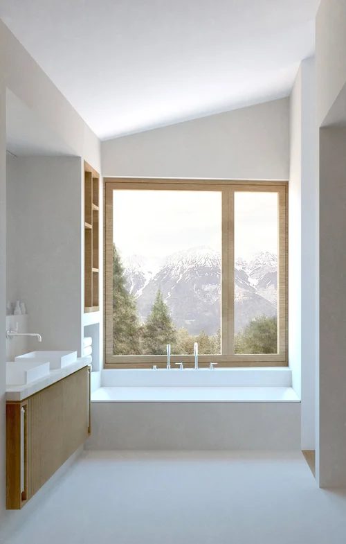 Our office was commissioned for the detailed design and planning for construction, with a particular emphasis on landscaping, the façade and all aspects of the interior fit-out. Great care was given to material choices and detailing throughout: in contrast to the dark exterior, the interior is defined by a warm, calm palette. Built-in furniture and joinery are crafted in light oak, paired with oak flooring and microtopping surfaces in soft beige tones. This restrained but rich combination of textures lends the home a modern yet inviting atmosphere, balancing alpine simplicity with contemporary comfort.
