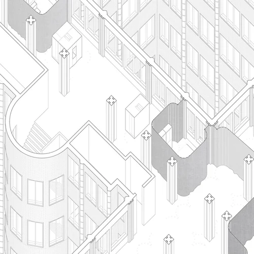 Tracks of Traces is an architectural response to the ever-growing construction industry and the ongoing environmental exploitation this is causing. Moving away from the dogma of the new built, it addresses the matter of deconstruction and reconstruction. A continued building method that maintains, reuses and exhibits traces of the old within the new.