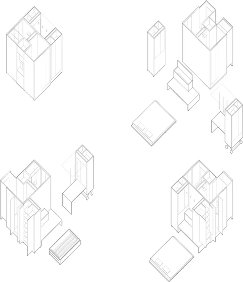 The project aims to keep the spatial qualities of the open office floor plan by replacing conventional pre-programmed rooms with individual cores. Every dweller will be given one core of its own. These can be further taken apart into domestic objects which will allow the individual to inhabit the open floor plan around the cores. The module’s fixed core consists of a wet strip featuring a lavatory and a shower and changing room. To allow for a more generous space within these two internal spaces they can be extended from within. Furthermore the core has an express kitchen with a small fridge and space for the essential appliances such as a coffee machine, a microwave or a toaster. Furniture parts, which can be detached and become objects of domestic functions such as sleeping, eating, working, living, complete the individual core.
