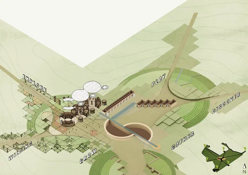 Memories of the park’s history are resurrected. The term “Clitter - Clite” interpreted as “Clay house” is re-highlighted using natural clay in the form of rammed earth construction. The original farmhouse timber structures are reintroduced and reinterpreted to form fragments of the new pavilion. The geometry of a traditional football pitch is playfully deconstructed in a grid informing the spatial organisation and landscaping. The pavilion’s lifecycle is regenerative, not only through the architectural interventions such as rainwater harvesting but also through the notion of communal growth by encouraging local farming of produce and natural wilding. To promote an ever-growing community for Brent Cross.
